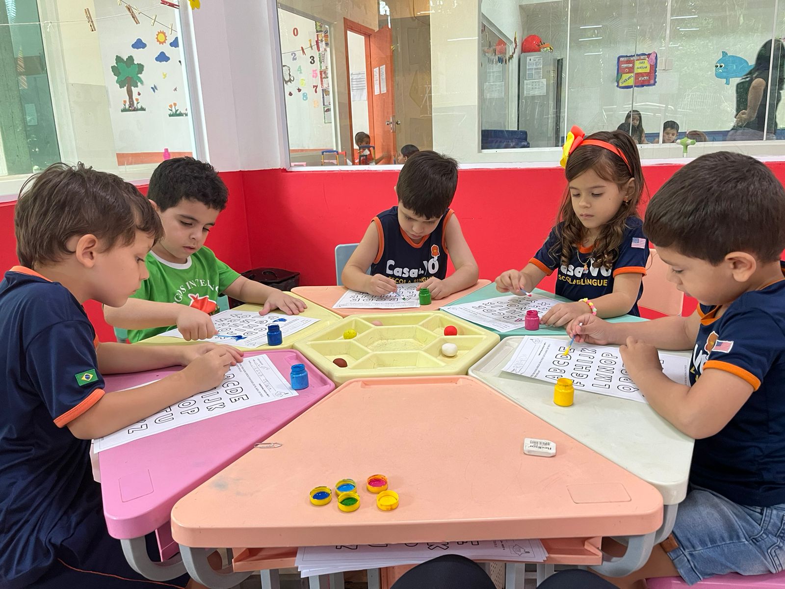 Em uma escola bilíngue de verdade, como a Casa de Vó, o inglês é o meio de instrução de parte do dia escolar. As crianças ouvem inglês, respondem em inglês, brincam em inglês e constroem conceitos em inglês — exatamente como aprendem o português.